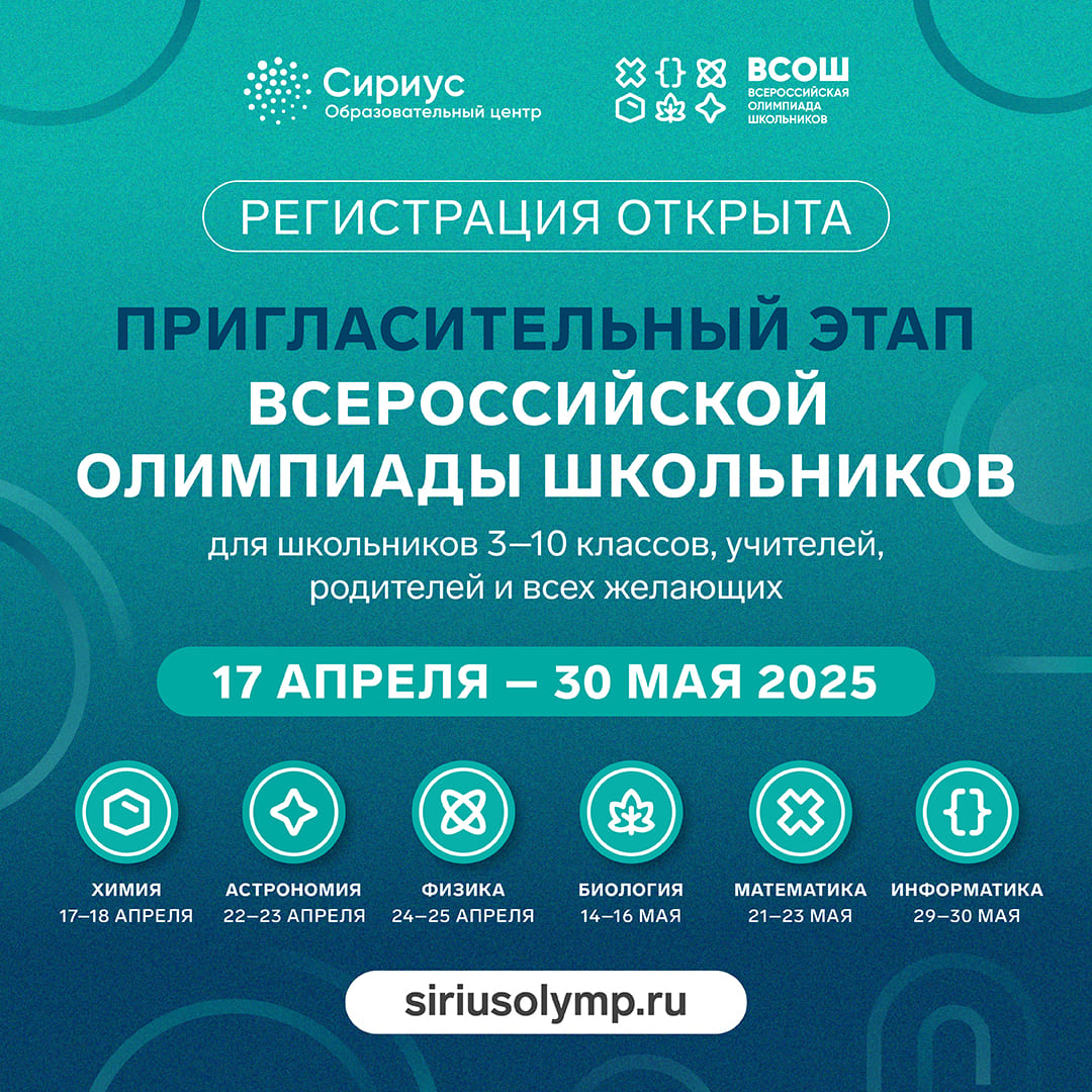 Всероссийская олимпиада школьников — главная и самая престижная олимпиада страны. Она состоит из четырёх этапов: школьного, муниципального, регионального и заключительного. Победители и призёры заключительного этапа могут поступить в профильные вузы без экзаменов. В 2025 году заключительные этапы по информатике, математике и биологии проходят на федеральной территории Сириус.