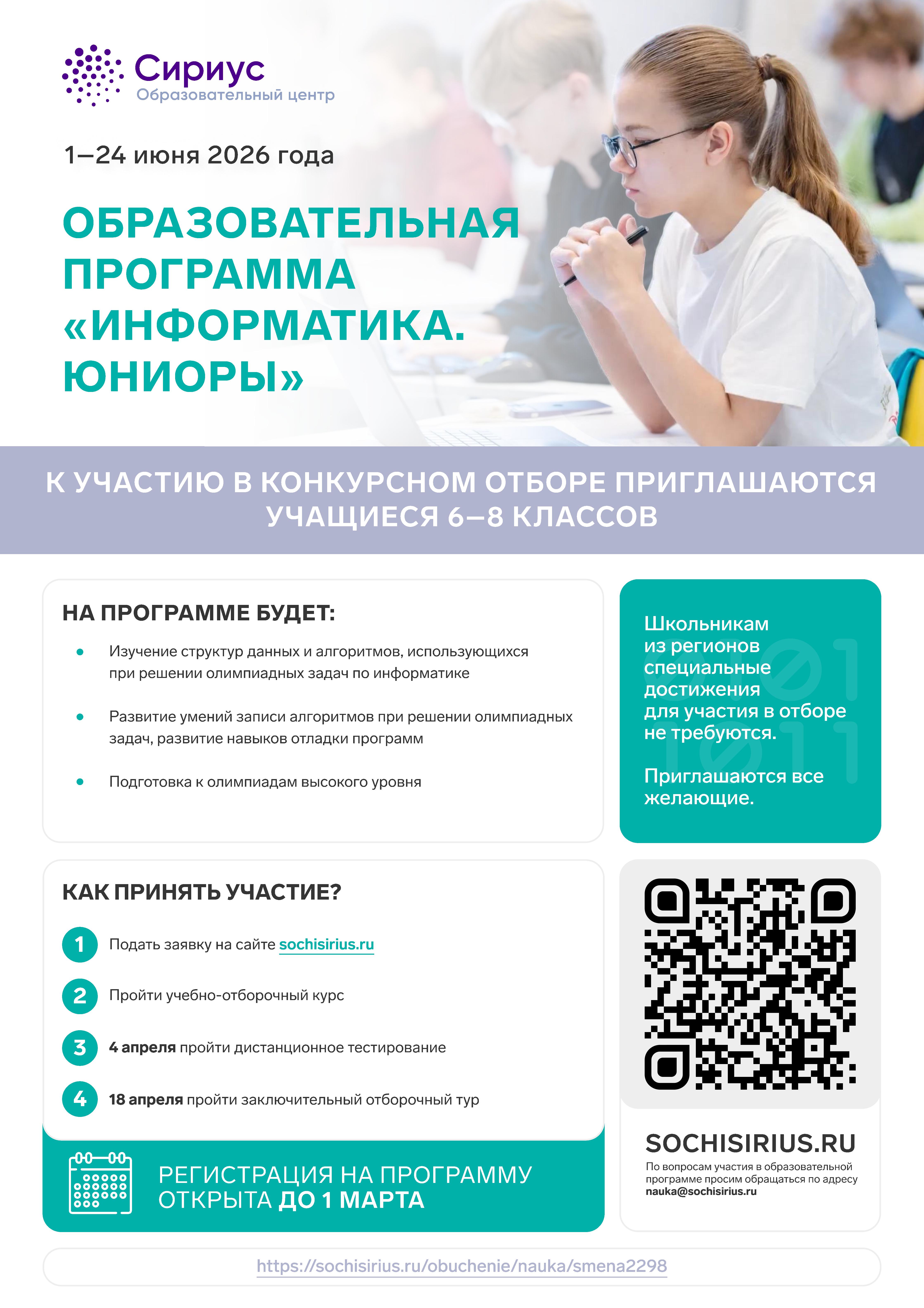 Если вы в 6–8 классе, но уже уверенно пишете код, приглашаем на программу Образовательного центра «Сириус» — «Информатика.Юниоры».