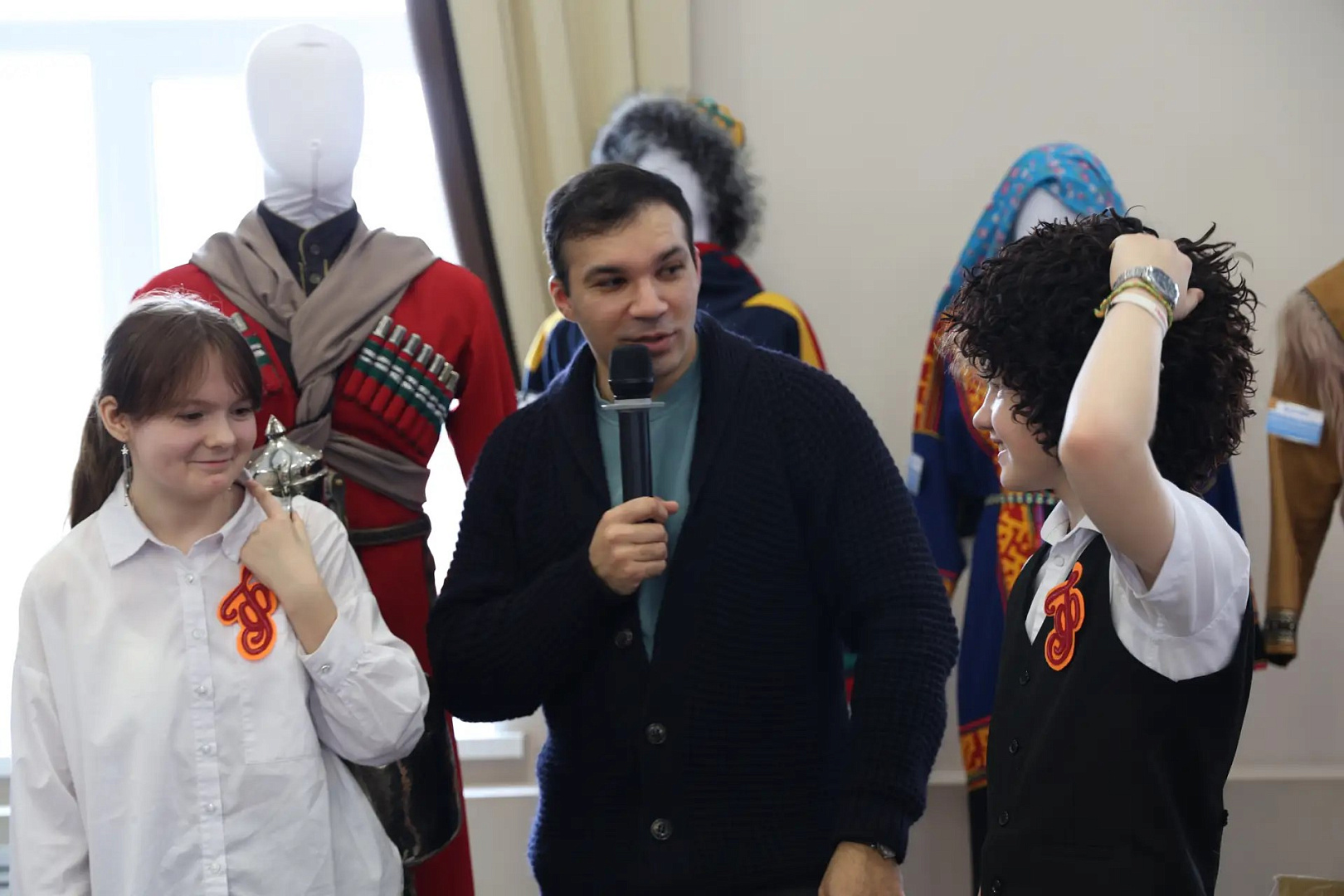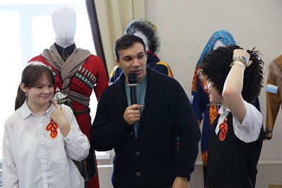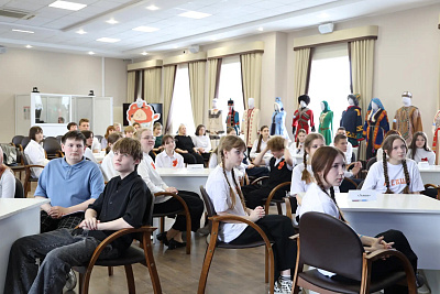 После представления команд ребята познакомились с выставкой костюмов народов России, которую провели представители АНО «Творческая мастерская межнациональной культуры и искусства «Народный стиль». Далее участников ждала увлекательная лекция «Живое русское слово: Александр Пушкин и Владимир Даль», которую прочитала Пименова М. В.